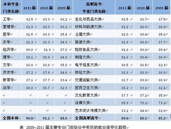 2011屆本科畢業(yè)生半年后就業(yè)率高的專業(yè)門類是工學(xué)(92.5%),低的是法學(xué)(86.8%);高職高專畢業(yè)生半年后就業(yè)率高的專業(yè)門類是生化與藥品大類(92.5%),低的是藝術(shù)設(shè)計傳媒大類(83.2%)。本科畢業(yè)半年后就業(yè)率高的專業(yè)類是能源動力類(96.6%),低的是中醫(yī)學(xué)類(84.9%);高職高專畢業(yè)半年后就業(yè)率高的專業(yè)類是機(jī)電設(shè)備類(94.1%),低的是醫(yī)學(xué)技術(shù)類(85.9%)。從三屆的就業(yè)率變化趨勢可以看出,本科專業(yè)門類中的醫(yī)學(xué)、農(nóng)學(xué)、理學(xué)專業(yè)門類半年后就業(yè)率處于上升階段。高職高專專業(yè)門類中,較多專業(yè)門類的半年后就業(yè)率都處于上升階段。