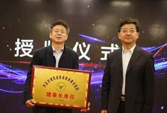 河北省畜牧獸醫(yī)局副局長顧傳學(xué)向河北省現(xiàn)代畜牧業(yè)職教集團(tuán)理事長單位楊靜利授牌。劉金奎提供