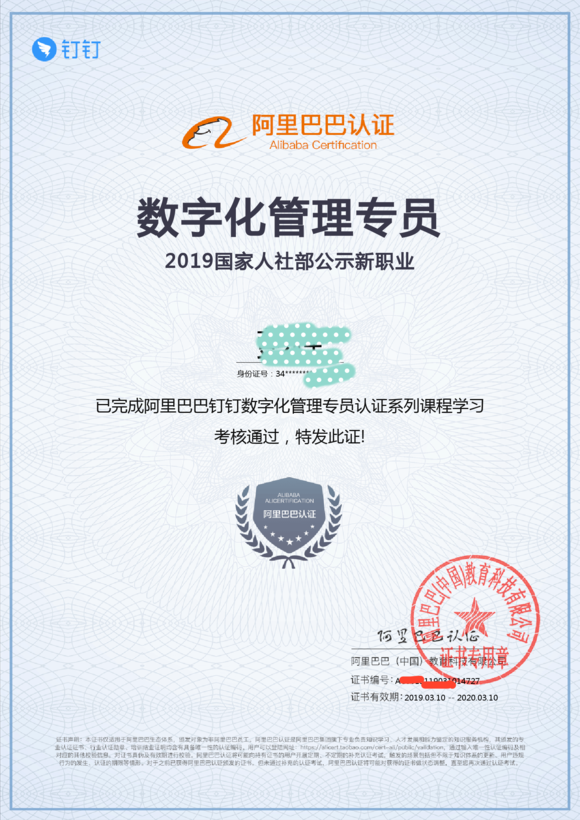 目前該職業(yè)分為數(shù)字化管理專員、數(shù)字化管理師和高級數(shù)字化管理師三個等級,學(xué)習(xí)成果終通過在線考試獲得阿里巴巴的官方認(rèn)證證書。