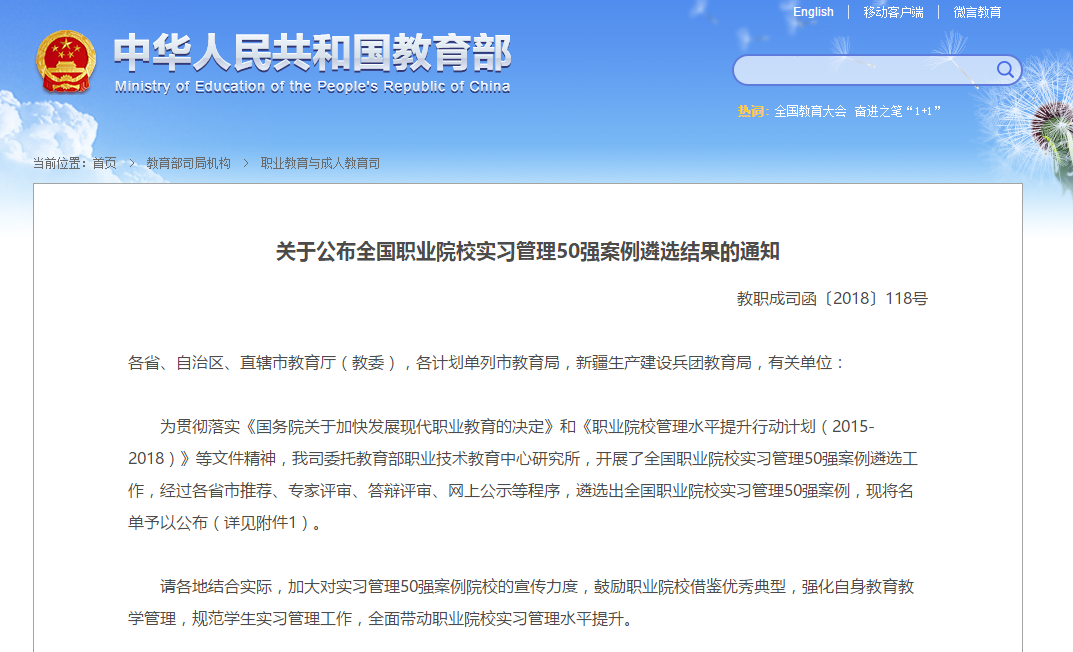 4月25日,教育部職業(yè)技術(shù)教育中心研究所公示了全國職業(yè)院校教學(xué)管理50強案例、學(xué)生管理50強案例遴選結(jié)果。綜合2018年7月發(fā)布了“全國職業(yè)院校實習(xí)管理50強”名單,結(jié)果顯示,共有106所職業(yè)院校榜上有名,其中有7所職業(yè)院校同時入選三大榜單,獲得“職校50強大滿貫”!