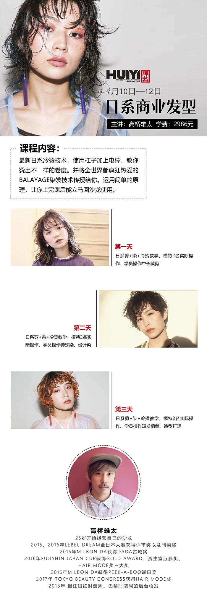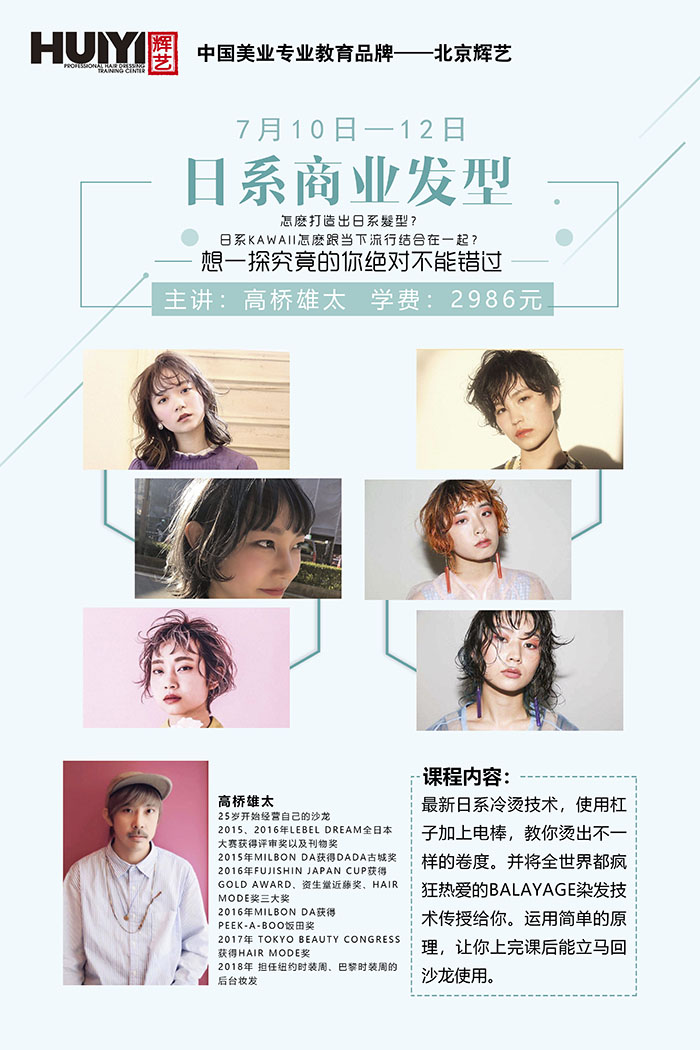 7月10-12號(hào):輝藝學(xué)院特聘來自日本東京的技術(shù)全能講師【高橋雄太】老師到校授課,時(shí)尚日式商業(yè)發(fā)型,課程3天,講解6款發(fā)型,30人小班,講師對學(xué)生手把手實(shí)操輔導(dǎo),名額有限,報(bào)名的小伙伴速度聯(lián)系許老師報(bào)名吧