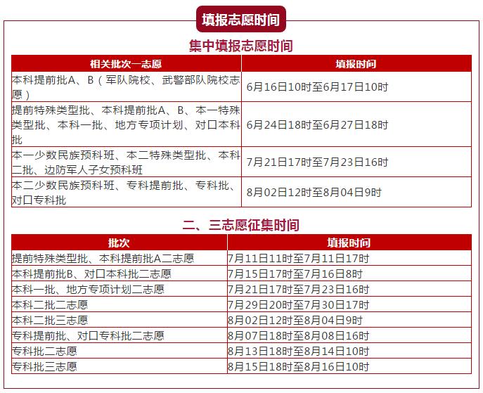 志愿填報安排在高考成績公布之前,采取估分填報的方式,具體時間為6月16日10時至6月17日10時。本科提前批A為使用本科一批錄取控制線的院校及專業(yè),本科提前批B為使用本科二批錄取控制線的院校及專業(yè)。