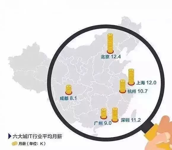 圖中就可以看出,北京平局月薪占據(jù)榜首,其二就是上海,接下來就是深圳,杭州,廣州,成都,這6大城市是屬于IT行業(yè)平均薪資居高的城市,有追求的IT從業(yè)者都會(huì)選擇去北上廣等地區(qū)工作,因?yàn)橛凶约旱淖非螅凶约旱睦硐搿?/span>