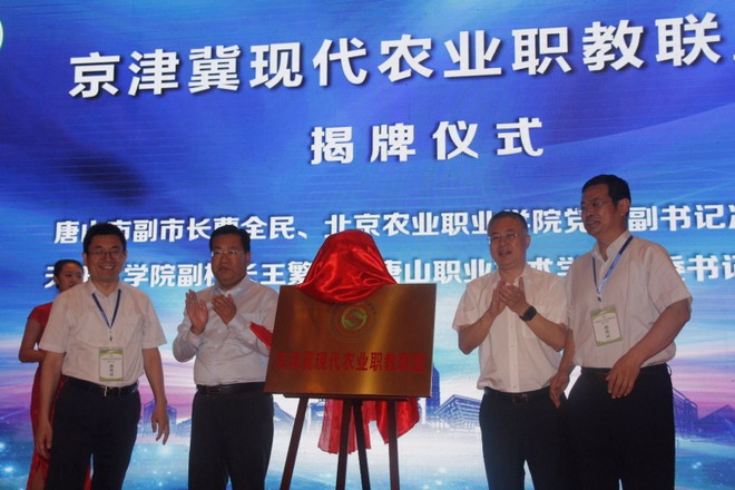 唐山市副市長曹全民、北京農(nóng)業(yè)職業(yè)學(xué)院黨委副書記馮學(xué)會(huì)、天津農(nóng)學(xué)院副校長王繁珍、唐山職業(yè)技術(shù)學(xué)院黨委書記盛新豐為京津冀現(xiàn)代農(nóng)業(yè)職教聯(lián)盟揭牌。北京市教育委員會(huì)職成處主任武曄、天津市教委職成教處主任湯之浩、河北省教育廳職成處副處長安順英、唐山市政府副秘書長孫友樹、唐山市農(nóng)業(yè)農(nóng)村局黨組書記張印勤、唐山市教育局副局長李連斌等領(lǐng)導(dǎo)出席會(huì)議。150余名高職院校、行業(yè)企業(yè)、科研院所等單位代表及記者共同見證了聯(lián)盟的成立。唐山職院副院長馬莉主持會(huì)議。