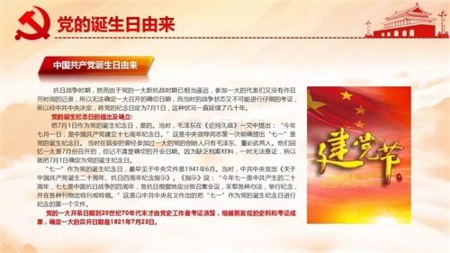 中國共產(chǎn)黨于1921年7月23日成立后,在反動軍閥政府的殘暴統(tǒng)治之下,只能處于秘密狀態(tài),沒有公開進行活動的環(huán)境。在大革命時期,黨忙于國共合作、開展工農(nóng)運動和支援北伐戰(zhàn)爭,沒有條件對黨的誕生進行紀念。把7月1日作為中國共產(chǎn)黨的誕辰紀念日,是偉大領(lǐng)袖毛澤東主席于1938年5月提出來的。當時,毛澤東主席在《論持久戰(zhàn)》一文中提出:“今年七月一日,是中國共產(chǎn)黨建立的十七周年紀念日”。這是中央領(lǐng)導同志第一次明確提出“七一”是黨的誕生紀念日。