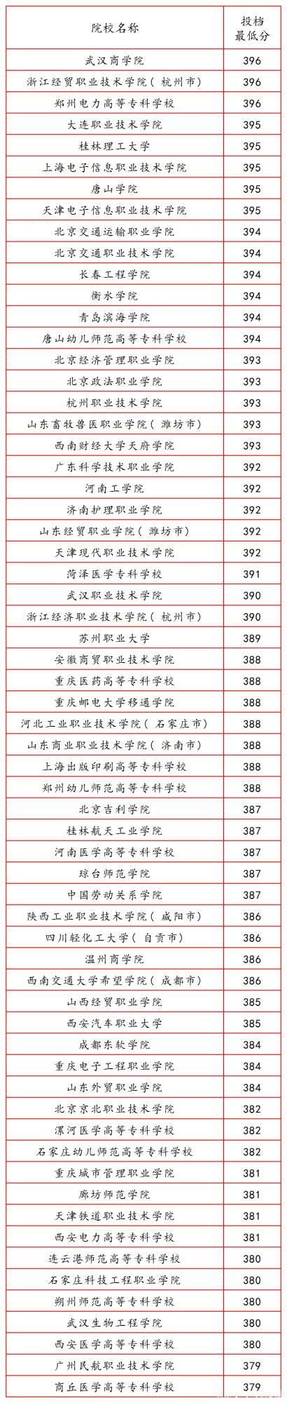 其它分數(shù)較高的還有承德醫(yī)學院、東北電力大學、河北師范大學、天津職業(yè)大學、長春工業(yè)大學、開封大學、蘭州交通大學等133所院校,這些院校的分數(shù)都在379分以上,全部超過二本線,堪稱是理科生難報考的院校。