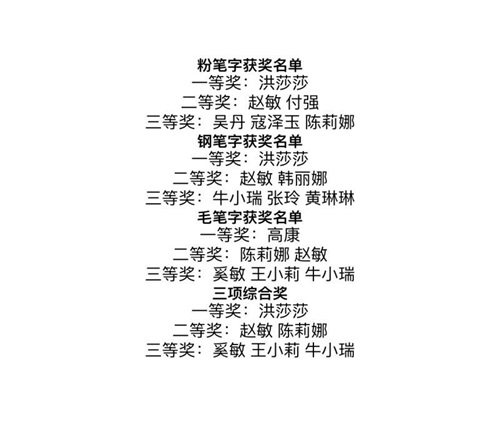 比賽的內(nèi)容為:粉筆字、鋼筆字、毛筆字。教務(wù)處統(tǒng)一命題、統(tǒng)一發(fā)放硬筆和毛筆字比賽用紙、統(tǒng)一安排黑板進(jìn)行粉筆字比賽用。要求用字規(guī)范,準(zhǔn)確,字體端正勻稱,大小適中。間架結(jié)構(gòu)合理,行筆流暢,力度適中。版面設(shè)計、布局合理。