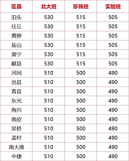 滄州一中 錄取參考線(文化分) 1、滄州市區(qū) 北大班:542分 珍珠班:530 分 實驗班:以教育局公布為準 2、滄州各縣市