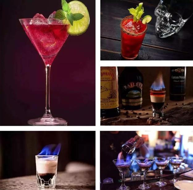 水母、多彩世界、草莓莫吉托、玫瑰荔枝、野格炸彈、森伯加煙酒、冰山瑪格麗特、噴火林寶堅(jiān)尼等