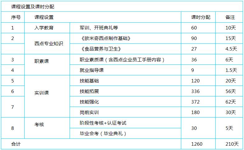 (其中入學教育60課時,占比4.8%;西點專業(yè)知識117課時,占比9.3%;職素課36課時,占比2.8%;就業(yè)指導課9課時,占比0.7%;考核、畢業(yè)典禮30課時,占比2.4%)。