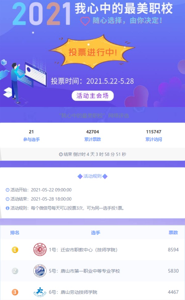 截止5月24日下午14:00,唐山市“我心中的最美職!鼻叭謩e為:遷安職教中心、唐山市第一職業(yè)中等專業(yè)學(xué)校以及樂亭縣綜合職業(yè)技術(shù)學(xué)校;