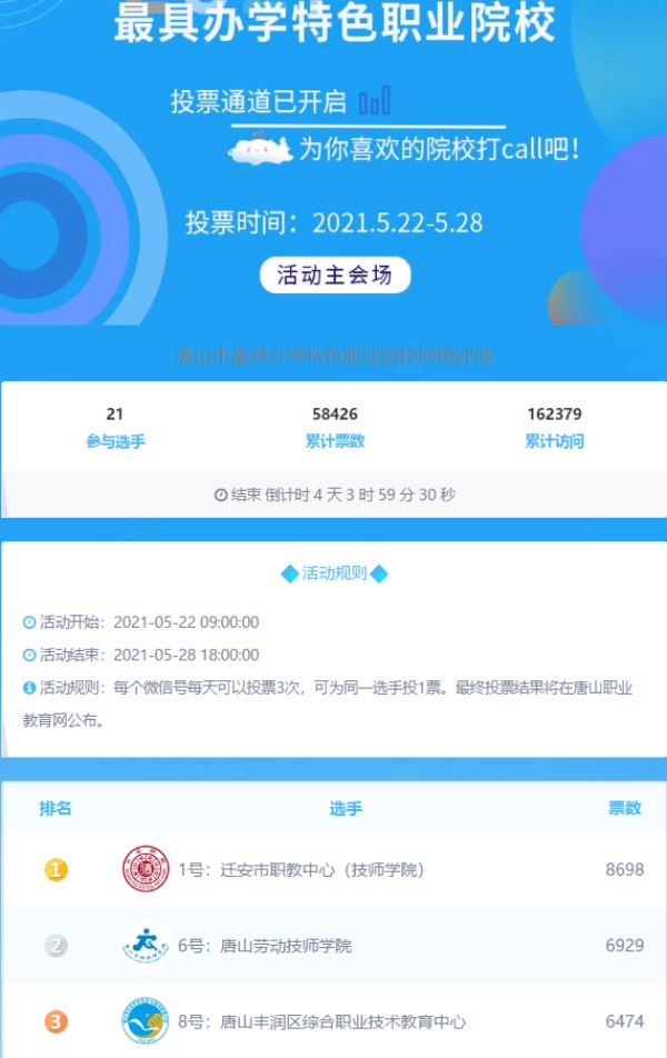 2021年5月28日18點,“職教唐山 精彩在冀”網(wǎng)絡(luò)評選最終投票結(jié)果將在唐山職業(yè)教育網(wǎng)公布。(實時評選結(jié)果請關(guān)注【職教網(wǎng)在線】公眾號)