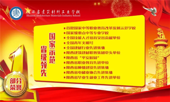 陜西省建筑材料工業(yè)學(xué)校多次被全國建材協(xié)會評為“全國建材行業(yè)先進(jìn)集體”和“全國建材行業(yè)技能人才培育突出貢獻(xiàn)獎(jiǎng)單位”、被團(tuán)中央授予“青年文明號”單位。連續(xù)多年被陜西省人力資源和社會保障廳評為“全省中專學(xué)校畢業(yè)生就業(yè)先進(jìn)單位”,連續(xù)多年榮獲“陜西電梯業(yè)先進(jìn)集體”、“陜西省建材行業(yè)先進(jìn)單位”。