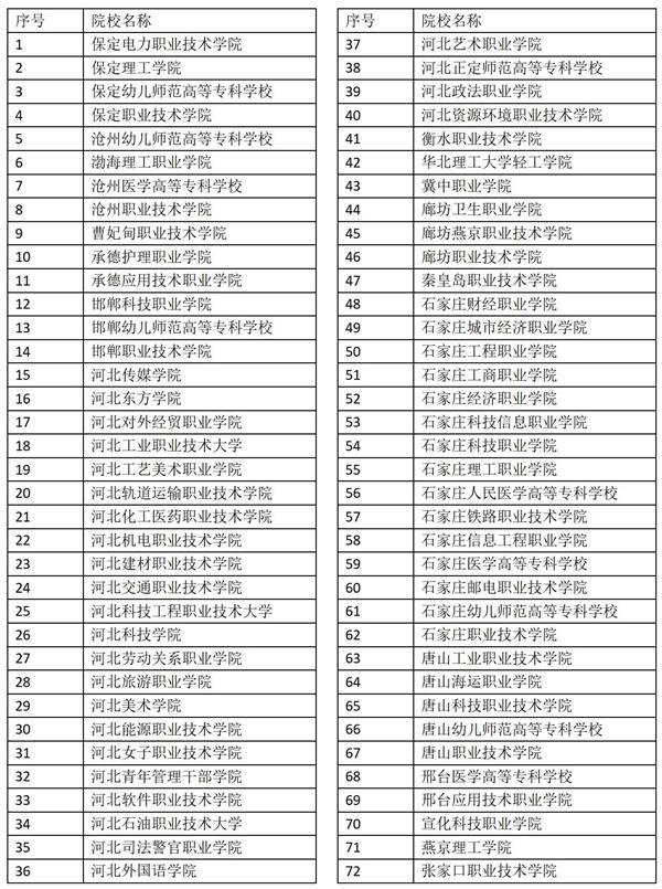 依據(jù)2022年高職單招報考須知來看,2022年在河北省進行高職單招的省內(nèi)院校有72所,名單如下: