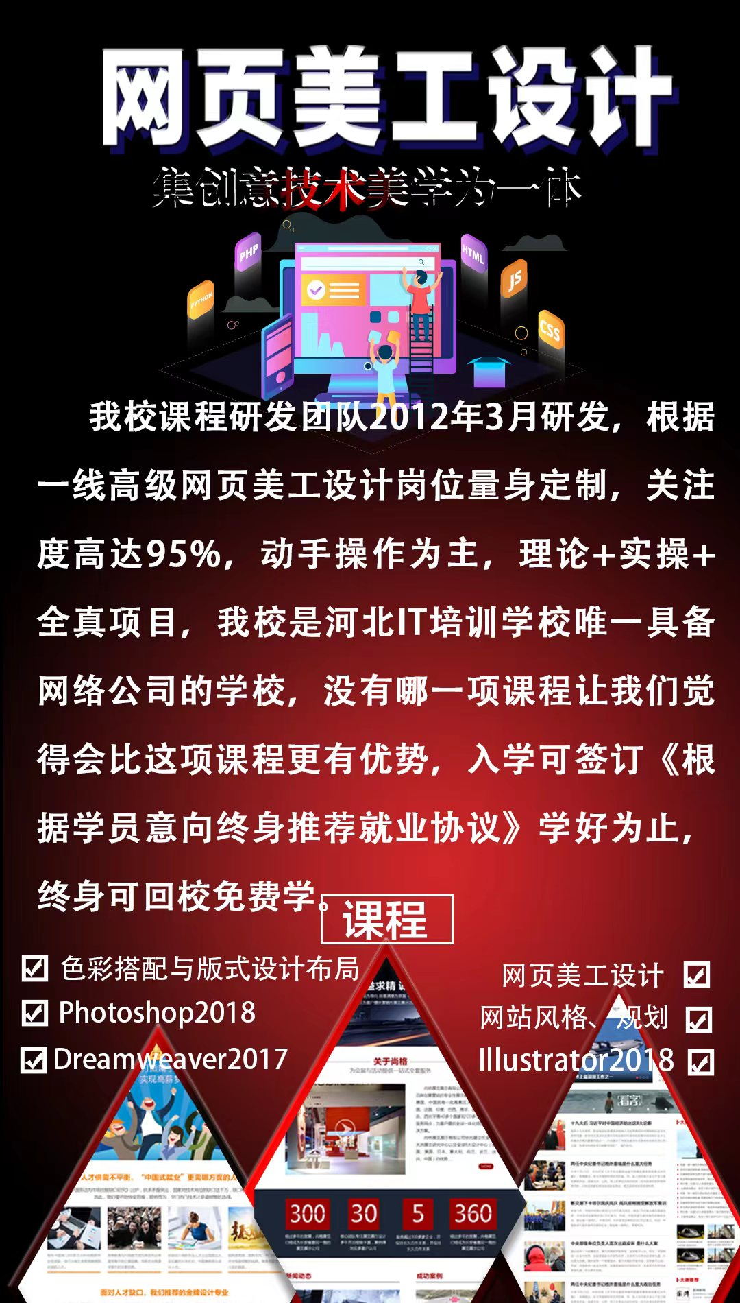 唐山市現(xiàn)代電腦學(xué)校網(wǎng)頁美工設(shè)計專業(yè)怎么樣?隨著互聯(lián)網(wǎng)和電商行業(yè)的發(fā)展,網(wǎng)頁美工設(shè)計專業(yè)逐漸火了起來,很多企業(yè)都需要進(jìn)行網(wǎng)頁的制作,來傳播我們的信息,精美的美工制作則能夠吸引到很多人的關(guān)注,所以未來發(fā)展前景是非常好的。唐山市現(xiàn)代電腦學(xué)校就開設(shè)了網(wǎng)頁美工設(shè)計專業(yè),接下來就來了解一下吧!
