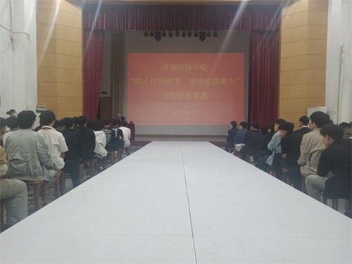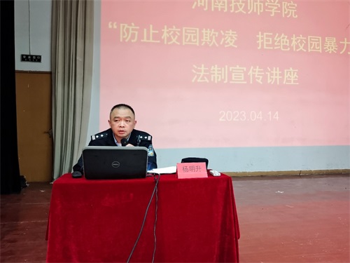 為有效提高廣大在校學生的安全防范意識和自我保護能力,從源頭上預防和減少以大欺小、以強欺弱等校園暴力事件發(fā)生,打造安全、文明、和諧的教育教學環(huán)境,4月14日下午,河南技師學院西校區(qū)邀請中原西路派出所指導員楊明升同志到校為師生開展了一場“防止校園欺凌、拒絕校園暴力”為主題的法制宣傳講座。