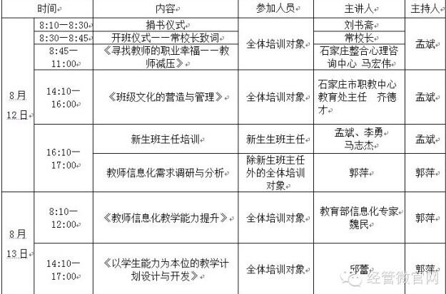 每年的暑假,河北經(jīng)濟管理學校都會進行全體教師及班主任的培訓,不拘泥于形式,內容豐富多彩,這是經(jīng)管人多年來的傳統(tǒng),今年也不例外。今年的暑期培訓為期2天,主題是教師職業(yè)能力的提升。從教師的職業(yè)心理分析展開,通過教師在學生管理,信息化能力與教學計劃開發(fā)能力等方面的講座與交流開展一系列培訓。收益多多哦!