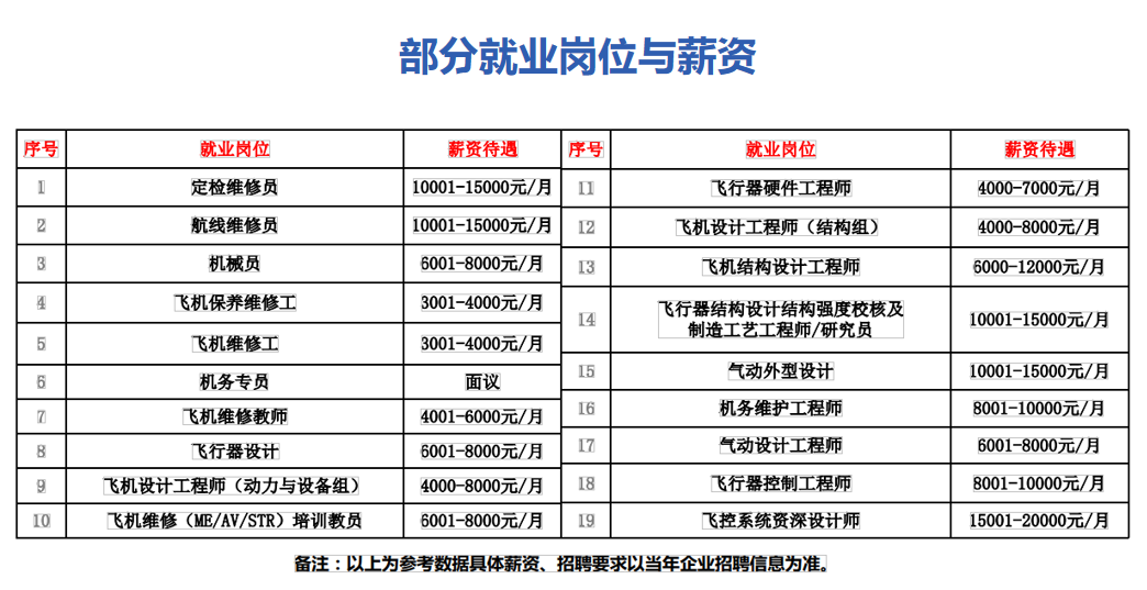 就業(yè)崗位:定檢維修員、航線維修員、機(jī)務(wù)專員、飛行器設(shè)計(jì)、氣動(dòng)外形設(shè)計(jì)、機(jī)務(wù)維護(hù)工程師等。