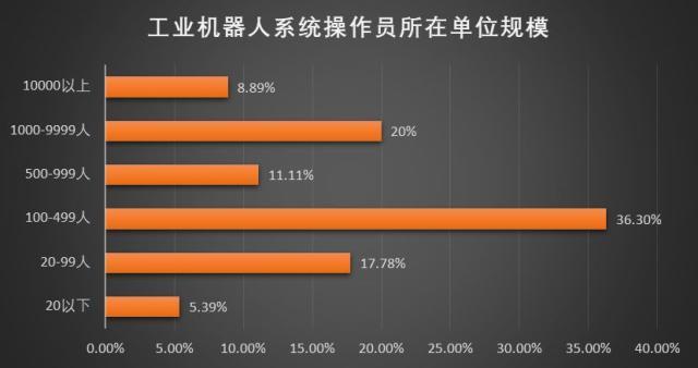 20人及以下占比5.39%,20-99人占比17.78%,100-499人占比36.3%,500-999人占比11.11%,10000-9999人及以上占比20%,10000以上的占比8.89%。工業(yè)機(jī)器人系統(tǒng)操作員所在企業(yè)規(guī)模分布均勻,大、中、小、微型公司都需要系統(tǒng)操作員推動(dòng)轉(zhuǎn)型。