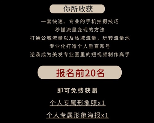 北京輝藝美發(fā)學校依據(jù)市場需求,開發(fā)出的【手機短視頻2.0版課程】開課日期11月2日-3日。兩天純干貨教授。主講老師為多年資深影視導演,近兩年來曾幫助服務了眾多美業(yè)人,授課百余場,得到了學生一致好口碑。想成為短視頻達人的朋友請聯(lián)系老師預約課程吧。