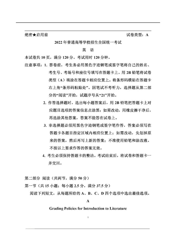 2022年全國高考英語試卷(新高考I卷)答案及解析