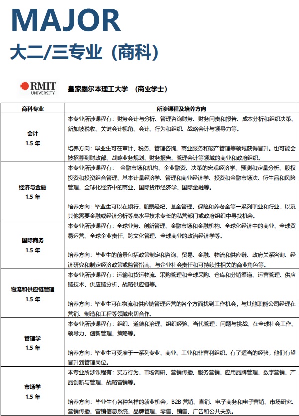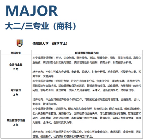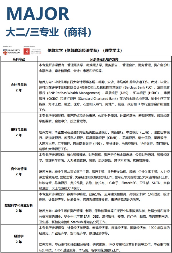 商科:人力資源管理、管理會計、商務(wù)金融、商法、宏觀經(jīng)濟學(xué)、運營管理、商業(yè)信息系統(tǒng)、