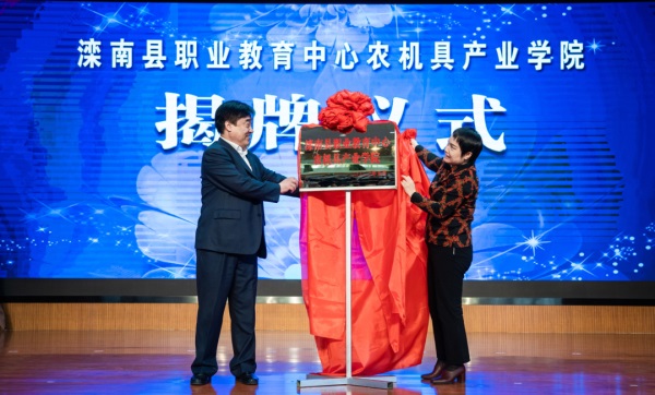 河北科技師范學(xué)院機(jī)電工程學(xué)院院長王慶祝、灤南縣政府副縣長賈秀梅為“灤南縣職教中心農(nóng)機(jī)具產(chǎn)業(yè)學(xué)院”揭牌。