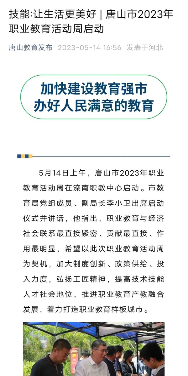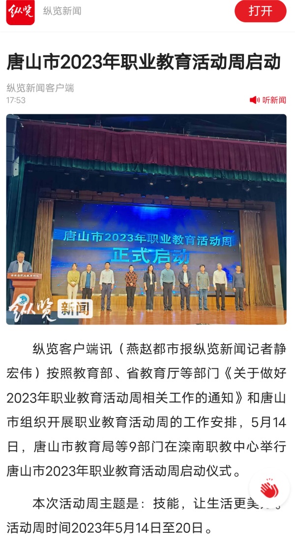 唐山教育發(fā)布、縱覽新聞、河北新聞網(wǎng)等媒體對(duì)唐山市2023年職業(yè)教育活動(dòng)周內(nèi)容進(jìn)行了宣傳報(bào)道。