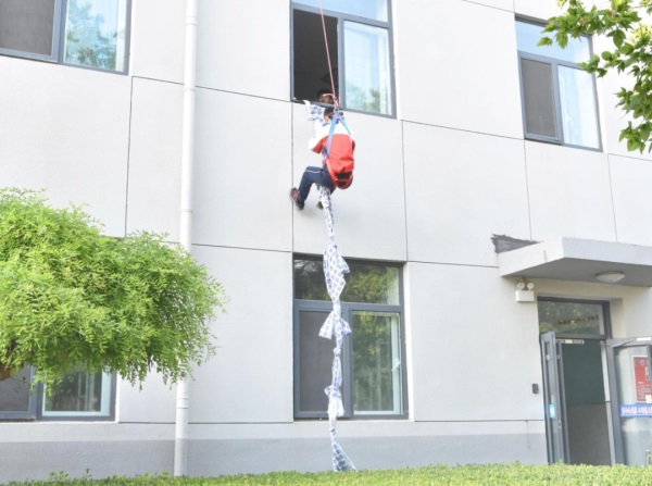 值得一提的是,二樓208宿舍進行了規(guī)范的掩蔽訓練,為被困人員提供了專業(yè)的應(yīng)對示范。而高空逃生環(huán)節(jié)更是本次演練的亮點,在專家的指導(dǎo)下,學生們利用六個床單連接成繩索,從樓上窗口安全下降,這一新增內(nèi)容不僅展現(xiàn)了專業(yè)的高空逃生技巧,更讓師生們對消防安全有了全新的認識。