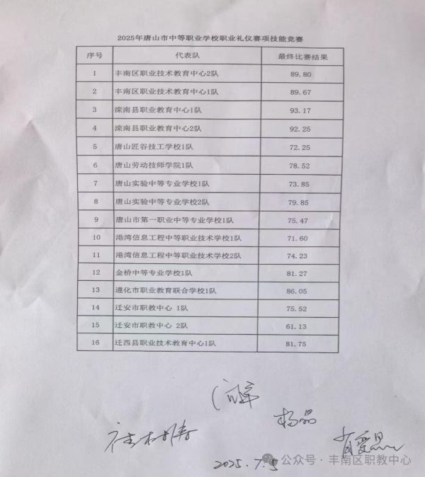 2025年7月5日,唐山市技能大賽職業(yè)禮儀賽項(xiàng)在灤南職教中心舉辦,在主管校長(zhǎng)田明同志與現(xiàn)代服務(wù)專業(yè)部王曉全主任的大力支持下,豐南職教中心邢慧琛、么依彤兩位指導(dǎo)教師帶領(lǐng)幼兒保育專業(yè)—1隊(duì):李思彤、劉思辰、劉禹彤、崔靜茹、田鑫語(yǔ)、高晗瑞,2隊(duì)畢桐雨、畢渃伊、王雪伊、?尚尽㈥悹q帆、劉思宇十二名學(xué)生分為兩組在全市16個(gè)代表隊(duì),96名選手參賽中取得優(yōu)異成績(jī),紛紛榮獲二等獎(jiǎng)。