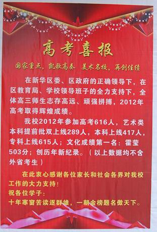 我校2012年高考再創(chuàng)佳績:參加高考616人,藝術(shù)類本科提前批雙上線289人,本科上線417人,?粕暇615人;文化成績第一名:霍瑩503分。(以上數(shù)據(jù)均不含外省考生)