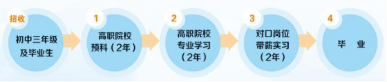 初中畢業(yè)生,在高等職業(yè)學(xué)院就讀高職聯(lián)盟預(yù)科課程2年后,參加高職學(xué)院聯(lián)盟院校的專業(yè)學(xué)習(xí)(?)2年,完成課程后校外帶薪實(shí)習(xí)2年,取得該院校全日制專業(yè)畢業(yè)證書。
