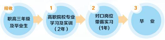 中職畢業(yè)生或?qū)僭谛H昙?jí)學(xué)生,直接選擇高職院校專業(yè),學(xué)習(xí)高職院校專業(yè)課程(?)2年,帶薪實(shí)習(xí)1年,取得該院校全日制畢業(yè)證書,進(jìn)入企業(yè)對(duì)口安置。