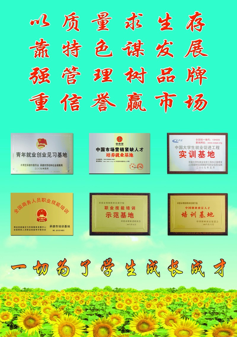 承德朝陽(yáng)職業(yè)學(xué)校是隸屬于承德為棟教育集團(tuán),由承德市人力資源和社會(huì)保障局批準(zhǔn)成立的一所職業(yè)技能培訓(xùn)學(xué)校。學(xué)校創(chuàng)辦于2007年11月,是河北省先進(jìn)職業(yè)學(xué)校;是承德市職業(yè)技能培訓(xùn)定點(diǎn)機(jī)構(gòu);承德市扶貧辦勞動(dòng)力轉(zhuǎn)移培訓(xùn)示范基地;中國(guó)大學(xué)生就業(yè)促進(jìn)工程承德培訓(xùn)基地;中國(guó)市場(chǎng)營(yíng)銷緊缺人才培養(yǎng)就業(yè)基地;承德市青年創(chuàng)業(yè)就業(yè)見(jiàn)習(xí)基地;中國(guó)創(chuàng)業(yè)致富人才培訓(xùn)基地。目前與集團(tuán)所屬承德通達(dá)中專學(xué)校公用校區(qū)。學(xué),F(xiàn)與國(guó)內(nèi)有關(guān)機(jī)構(gòu)合作,常年開(kāi)展銀行服務(wù)專業(yè)定向就業(yè)培訓(xùn)班。