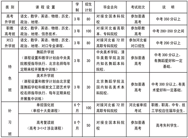 學(xué)校秉持“為了學(xué)生美好未來(lái)”為育人目標(biāo),以普通高考升學(xué)需求為導(dǎo)向,以職教高考政策為基準(zhǔn),以對(duì)口升學(xué)為基礎(chǔ),采用數(shù)字化多媒體教學(xué),堅(jiān)持普通高中文化課與專(zhuān)業(yè)基礎(chǔ)課程的無(wú)縫對(duì)接。確立品牌,特色發(fā)展的戰(zhàn)略做引領(lǐng),成就一所辦學(xué)條件高標(biāo)準(zhǔn)、學(xué)校文化高品位、教師隊(duì)伍高素質(zhì)和教育教學(xué)高質(zhì)量的高考校區(qū)。