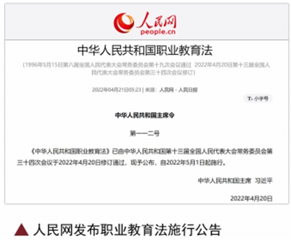 同時(shí)以立法的形式規(guī)定:國家發(fā)揮企業(yè)的重要辦學(xué)主體作用,推動(dòng)企業(yè)深度參與職業(yè)教育,鼓勵(lì)企業(yè)舉辦高質(zhì)量職業(yè)教育。建立健全適應(yīng)經(jīng)濟(jì)社會(huì)發(fā)展需要現(xiàn)代職業(yè)教育體系,產(chǎn)教深度融合。