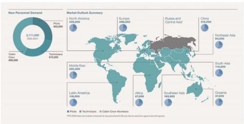 根據(jù)波音公司的2022年發(fā)布的《民用航空市場展望》和《飛行員和維修技師展望》預(yù)測,全球機(jī)隊(duì)規(guī)模到 2041年預(yù)計(jì)將增長近一倍達(dá)到47080架。未來20年全球?qū)⑿枰?/span>210萬新的民航專業(yè)人員來安全地支持航空旅 行復(fù)蘇并滿足長期增長需求。